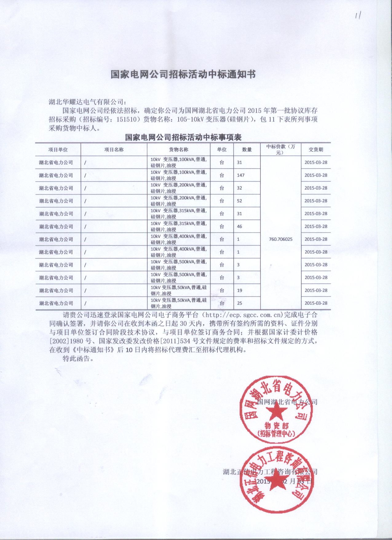 热烈祝贺人生就是博电气在国网湖北省电力公司2015年第一批协议库存招标采购活动中,同时中油浸式变压器和高过载油浸式变压器,共计1308万元,希望公司在新的一年继续努力取得更大的成绩!